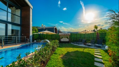 Sapanca 6 Kişilik Lüks Bungalov, 2+1 Isıtma Havuzlu - Göl Manzaralı - Şömineli - Kısmi  Korunaklı